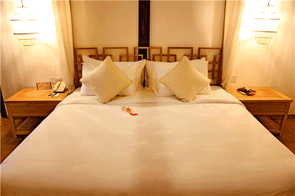 透过窗外总是美景,或是翠绿欲滴的园景,或是山中挺拔的翠竹,天气好时,甚至还能望见漫天星轨。世界级品牌床垫上上加铺软垫,无比柔软舒适,配上高档的床品布草,以及遮光效果极好的麻织窗帘,成全了我一夜好眠。